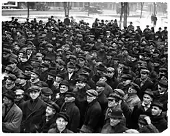 On the morning of Wednesday, December 5, about 15,000 unionists met at the Saint Paul Auditorium and heard speeches from notable labor activists, including Mayor Van Lear.[37] The unionists pledged their support to the streetcar union members and demanded the firing of both McGee and Charles W. Ames from the MCPS.[37] Additionally, they voted to wait until December 11 for federal intervention, vowing to gather again and vote on a general strike if intervention had not occurred by that time.[37] In a bid to show he was not antilabor, Governor Burnquist fired Ames, though kept McGee on the commission.[37] Several days later, on December 7, APL members learned through espionage that some machinist union members were planning a possible statewide general strike.[41] A general strike in the Twin Cities was officially declared to begin at 10:00 a.m. on December 13.[42][43] The union stated that they expected 30,000 people to go on strike, prompting fears that martial law would be declared.[42][44] Governor Burnquist ordered that all liquor stores be closed and instructed the sheriffs of both Hennepin and Ramsey counties to maintain order.[42] By noon, over 10,000 people had walked out of their jobs.[42][43] By that time, Secretary Baker, acting under the authority of United States President Woodrow Wilson, telegraphed William Bauchop Wilson of the President's Mediation Commission to investigate the developments in the Twin Cities, citing a "federal interest" in the matter.[42] Having achieved their goal of federal intervention, at 1:30 p.m., E. G. Hall, the president of the Minnesota chapter of the AFL, called off the strike.[42] In total, this general strike had lasted less than four hours,[32] with no reports of violence.[42] Governor Burnquist, while agreeing to meet with federal mediators, voiced stern opposition to the federal government's decision, calling it an overreach of their power.[42]