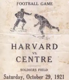 - 1 2 3 4 "Official Program: Football Game, Harvard vs. Centre" (PDF). Irwin Score Board. October 29, 1921. pp. 1–3. Archived from the original (PDF) on February 21, 2015. Retrieved September 20, 2022.