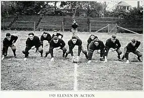 1921 was Wallace Wade's first year as a full-time assistant coach for the Commodores, and the intensity of their practices had increased since his arrival[1] (the first workout on September 12).[4][5] Wade had played guard on a Brown Bruins football team which represented the Eastern U.S. in the 1916 Rose Bowl. Before coming to Vanderbilt Wade coached at the Fitzgerald & Clarke School in Tullahoma, Tennessee, where he won a state prep-school championship in 1920 with a 16–3 record.[6] Also moving from Fitzgerald & Clarke were Lynn Bomar, Hek Wakefield, Pos Elam, and Red Williams. Other Commodore players debuting on the team included Putty Overall and Rupe Smith, who played for the Middle Tennessee State Normal School in the years surrounding the First World War.[n 2]
