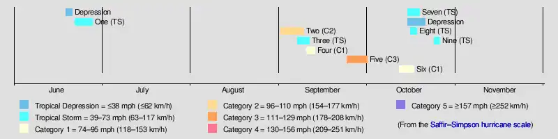 The 1923 Atlantic hurricane season featured 11 tropical cyclones, 9 of which intensified into tropical storms, the most since 1916. Four of the tropical storms intensified into hurricanes, one of which reached major hurricane intensity—Category 3 or higher on the modern-day Saffir–Simpson hurricane wind scale.[1] No tropical storms or hurricanes formed in or entered the Caribbean Sea.[2] The first known system, a tropical depression, formed on June 19, while the last known system, a tropical storm, transitioned into an extratropical cyclone on October 26. A total of Additionally, an October tropical depression was previously recognized as a tropical storm until reanalysis in 2009, while the first and third tropical storms were added to the Atlantic hurricane database that year. The sixth, seven, and eight storms as well as the October tropical depression existed simultaneously on October 16.