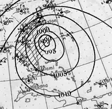 A tropical depression developed near the Yucatan Peninsula early on November 27.[6] The depression drifted southeastward and gradually strengthened into a tropical storm.[6] Once in the gulf, it accelerated and intensified to winds of 65 mph (105 km/h).[10] Early on December 1, the storm made landfall near Fort Myers, Florida, at the same intensity. The system weakened and soon became extratropical. The extratropical cyclone emerged over the eastern Atlantic several hours later and regained hurricane-force winds. By 0000 UTC, the extratropical system peaked with winds of 90 mph (140 km/h) and a minimum pressure of 980 mbar (29 inHg).[6] Around this time, the U. S. S. Patoka, which was in the vicinity of the storm, recorded a pressure of 978.5 mbar (28.90 inHg).[2] The northeastward movement slowed shortly after crossing Florida.[6] Around 2300 UTC, it made landfall between Wilmington and Cape Hatteras[2] with winds equivalent to a minimal hurricane. Shortly after landfall, maximum sustained winds in the storm dropped below 75 mph (121 km/h).[6] A strong area of high pressure located over the Canadian Maritimes caused the system to turn east-southeastward.[2] On December 5, the storm weakened further to the equivalent of a tropical depression as the system began to move towards the south.[6] The remnants of the storm continued eastward, passing several hundred miles north of Bermuda later that day. The cyclone was reported near the Azores on December 9, before finally merging with another cyclone over the North Atlantic.[2]