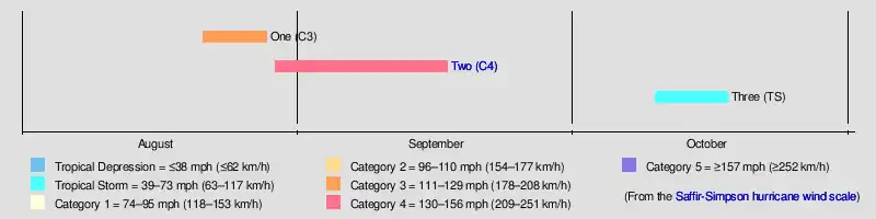 The 1930 Atlantic hurricane season was the second least active Atlantic hurricane season on record in terms of tropical storms formed, only behind 1914, with only three systems reaching tropical storm intensity. Of those three, two reached hurricane status, both of which also became major hurricanes, Category 3 or higher storms on the Saffir–Simpson hurricane wind scale.[1] The first system developed in the central Atlantic Ocean on August 21. Later that month, a second storm, the Dominican Republic hurricane, formed on August 29. It peaked as a Category 4 hurricane with winds of 155 mph (250 km/h). The third and final storm dissipated on October 21.