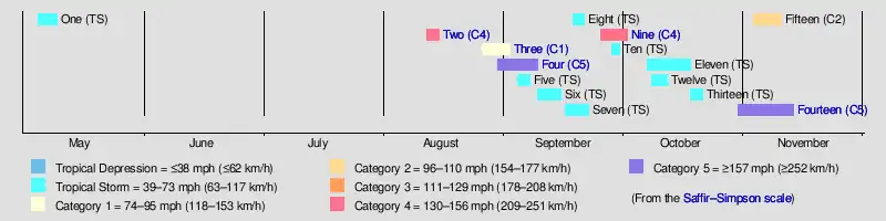 Fourteen | October 30 – November 13 | Category 5 hurricane | 175 (280) | ≤915 | Leeward Islands, Venezuela, Colombia, Jamaica, Cayman Islands, Cuba, the Bahamas, Bermuda | $44 million | >3,144 | [41][42][43][47] | ||