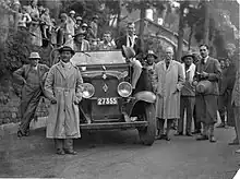 The descent was made to Chumbitang, and thence to Yatung, past the monastery at Khajuk, where the lama and monks were mystified as to why anyone would wish to climb Mount Everest.[26] The British trade agent in Yatung, Captain A. A. Russell, entertained members of the party, followed by a game of polo organised by Wood-Johnson. The entire expedition rendezvoused at Gautsa, where Ruttledge made Shebbeare "second-in-command".[27] Here the weather became much colder, with the party's first snows coming on the evening of 22 March. Moving past Phari Dzong on 25 March, a diversion over the Tang La from the normal route on account of snow was made in tremendous wind, dropping down to Shabra Shubra and then over the Dongka La and Chago La to Limbu, Tatsang and finally Kampa Dzong, reached on 29 March, from a pass above which the party had its first view of Mount Everest one hundred miles in the distance. At Kampa Dzong, which possessed "architectural beauty of the highest order", Ruttledge clad himself in mock formal dress – a Tibetan silk gown with a sheepskin lining and red girdle, topped by a collapsible opera-hat that had originally been brought along from England as a reward to the most successful porter – to meet the nyapala. Ruttledge commented: "The effect was all that could be desired. Here obviously was a man [himself] of standing in his own country. Deep called unto deep in the most friendly manner, with mutual respect; and our negotiations were completely successful." The nyapala invited the party to tour the dzong. The nearby grave of A. M. Kellas, the Scottish pioneer climber who had died in 1921 on his way to the first expedition to Mount Everest, had been disturbed and so expedition members dragged a fresh slab to cover the spot, re-cut the existing inscription, and performed a brief ceremony over it.[28] The advance stores had arrived at Kampa Dzong, as had the yaks and Longland, as quartermaster, set to organising them. The party departed on 2 April, passing Lingga and Mende on the way to Tengkye Dzong. Here a football match was staged, Boustead gave an exhibition of boxing and Longland put on a display of pole-vaulting using a bamboo pole (photographed by Smythe). Leaving the town on 5 April, the party travelled on to Khengu over the Bahman Dopté pass; at Khengu Lopsang Tsering fell off his pony and broke his collarbone; the anaesthetic administered by Greene stopped his heart, and only vigorous resuscitation, aided by coramine, saved his life.[29]