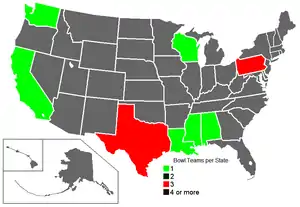 ![]() Number of bowl games per state. Note that the Bacardi Bowl was held in Havana, Cuba. | |||||||||||||||||||||||||||||||||||||||||||||