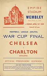 The 1944 Football League War Cup South Final was the final of the southern section of Football League War Cup, an unofficial cup competition held in England during the Second World War as a replacement for the suspended FA Cup. The match took place at Wembley Stadium on 15 April 1944 and was won by Charlton Athletic, who beat Chelsea 3–1. Charlton later contested a play-off against the winners of the equivalent North final, Aston Villa.