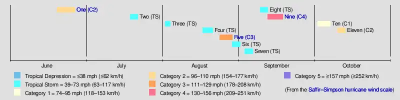 Nine | September 12 – 18 | Category 4 hurricane | 130 (215) | 949 | Leeward Islands, Turks and Caicos Islands, Bahamas, Florida, Georgia, The Carolinas | $60 million | 26 | |||