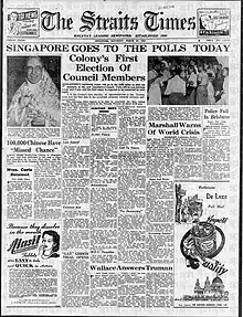 General elections were held for the first time in Singapore on 20 March 1948,[1] when six of the 22 seats on the Legislative Council became directly-elected.