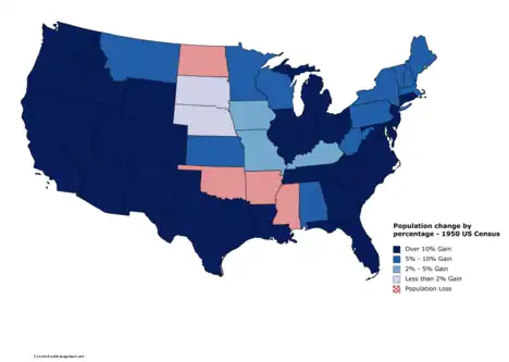 The 1950 United States census, conducted by the Census Bureau, determined the resident population of the United States to be 158,804,396, an increase of 14.5 percent over the 131,669,275 persons enumerated during the 1940 census.[1]