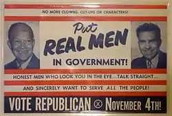 Eisenhower campaigned by attacking "Korea, Communism, and Corruption," issues that the Republicans regarded as the failures of the outgoing Truman administration to solve.[13] The Eisenhower campaign accused the administration of "neglecting Latin America" and thus "leading them into the arms of wily Communist agents waiting to exploit local misery and capitalize on any opening to communize the Americas."[14] Charges that Soviet spies had infiltrated the government plagued the Truman administration and became a "major campaign issue" for Eisenhower.[15] The Republicans blamed the Democrats for the military's failure to be fully prepared to fight in Korea, accused the Democrats of harboring communist spies within the federal government, and criticized the Truman administration for the many officials who had been accused of various crimes.