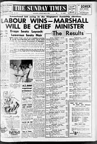 Much to the surprise for British, who had anticipated a Progressive victory and its leader, Tan Chye Cheng, to emerge as Chief Minister, it was the Labour Front that garnered the most seats and its chairman, David Marshall, thus became Singapore's first Chief Minister. Both losing and winning parties were shocked by the results.[1] Labour Front formed a government with support of the Malayan Chinese Association (MCA), UMNO and the Malay Union.