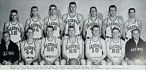 The 1956-57 team, unfortunately, would begin a downward spiral for Combes success, sending it into a time span where his teams would finish in the lower half of the Big Ten for four of six years. A highlight of the 1957 season would take place on December 17, 1956, when Illinois defeated San Francisco, 62-33, snapping the Dons’ 51-game regular-season win streak. This season also marked the first time that a Fighting Illini team entered a holiday tournament. The Kentucky Invitational brought Southern Methodist, Dayton and Illinois to Lexington for a two-day tournament, once again matching Adolph Rupp with Combes. Combes had talented lettermen return including the leading scorers George Bon Salle, Don Ohl and team "captain" Harv Schmidt. It also saw the return of Bill Altenberger, Hiles Stout, John Paul and Ted Caiazza. The team also added sophomore Roger Taylor. The Illini finished the season with a conference record of 7 wins and 7 losses, finishing in 7th place in the Big Ten. They would finish with an overall record of 14 wins and 8 losses. The starting lineup included George Bon Salle at the center position, Roger Taylor and Don Ohl at guard and Harv Schmidt and Hiles Stout at the forward slots.[1]