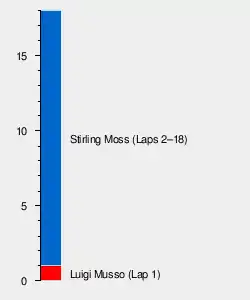 There were no official Practice sessions. However, due to the circuit being a road course, many drivers drove observation laps in road cars two days before the race.[1]: 100 Qualifying consisted of two sessions which were held on the Saturday before the Sunday race-from 07:00 to 09:30 and 16:30 to 18:30 local time. Between the two sessions, the straw bales were removed and the road was opened up again to the public.[1]: 103 At the end of the sessions, Fangio set the quickest lap time of a 9:44.6 which gave him pole position.[10] He set an average lap speed of 103.95 mph (167.29 km/h), which unofficially beat the previous lap record of 89.2 mph (143.6 km/h) because it was set during qualifying.[11] Moss was second with a 9:54.7 and Musso was third with a 10:00.0.[10]