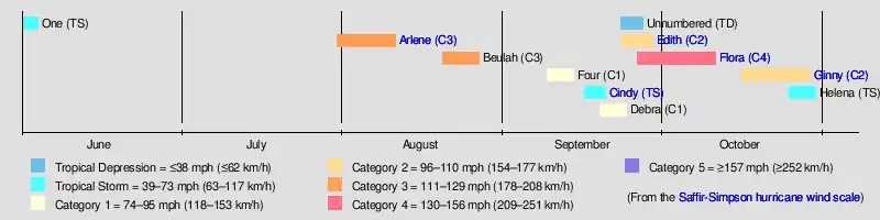 Tropical cyclogenesis began early, an unnamed tropical storm developing on June 1. However, activity ceased for nearly two months, before Arlene formed on July 31. Another system formed in August, Hurricane Beulah. September was much more active, with Cindy, Debra,[2] an unnumbered tropical depression.[7]: 270–271 Edith, and Flora all developing in that month. Flora was the most intense tropical cyclone of the season, peaking as a Category 4 hurricane with winds of 150 mph (240 km/h) and a minimum barometric pressure of 933 mbar (27.55 inHg). There were two other system in October, Hurricane Ginny and Tropical Storm Helena; the latter dissipated on October 30.[2]