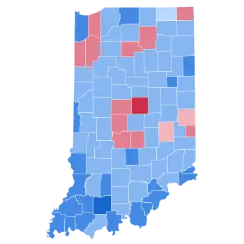This is the only time that Randolph County and Wabash County voted for a Democratic presidential candidate.[3] This was also the first time Indiana voted Democratic since 1936.[4] As of the 2020 presidential election, this is the last election in which the following counties voted for a Democratic presidential candidate: Allen, Adams, Bartholomew, Brown, Benton, Carroll, Cass, Clay, Clinton, Daviess, Decatur, DeKalb, Elkhart, Fayette, Fountain, Franklin, Grant, Hancock, Henry, Howard, Huntington, Jackson, Jay, Jennings, LaGrange, Lawrence, Marshall, Miami, Montgomery, Noble, Orange, Parke, Pulaski, Putnam, Ripley, Shelby, Tipton, Warren, Wells, White, and Whitley.[5]