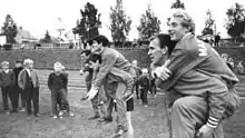 ![]() Manchester United players during their preseason tour in Finland, 21 September 1965. In front Pat Crerand carries Denis Law; middle George Best carries Tony Dunne; at back Noel Cantwell carries Pat Dunne. | ||||