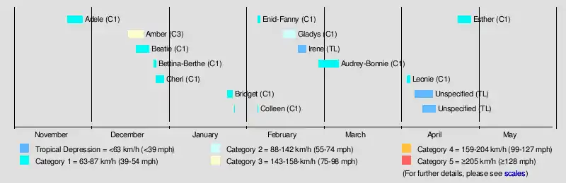 Gladys | 15–20 Feb | Category 2 tropical cyclone | 95 (60) | 987 | Western Australia | Unknown | Unknown | |