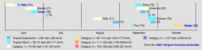Tropical cyclogenesis began in June, with three named storms during that month – hurricanes Abby and Brenda and Tropical Storm Candy – tying several seasons for the most named storms in June.[4] Despite the quick start, activity abruptly slowed, with only a tropical depression in July.[5] The next named storm, Hurricane Dolly, existed from August 10 to August 17, while Tropical Depression Eleven formed later that month.[4] September was the most active month, with five tropical depressions, two tropical storms, and one subtropical storm, which peaked with an intensity equivalent to a Category 1. In October, Hurricane Gladys became the strongest tropical cyclone of the season, despite maximum sustained winds of only 100 mph (160 km/h) and a minimum barometric pressure of 965 mbar (28.5 inHg).[5]