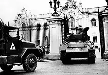 Additionally, due to the early timing, the chief military aide to President Belaúnde was still sleeping at his home away from the Presidential Palace, and the Presidential Guards immediately surrendered at the sight of the armored squadron at the steps of the pavilion.[3]