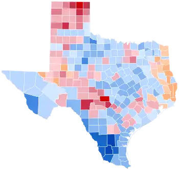 Wallace, who had been rivaling the two major party nominees in early polls, came in a distant third, with 18.97 percent of the vote, his lowest in any former Confederate state. Wallace did win 21 of Texas' 254 counties, which was enough for him to also carry one congressional district. Wallace's base of support was primarily in rural East Texas, which is more culturally tied to the Deep South than the rest of the state, although he did carry four counties in the West Texas region, with Loving County being the westernmost county in the country to vote for Wallace.
