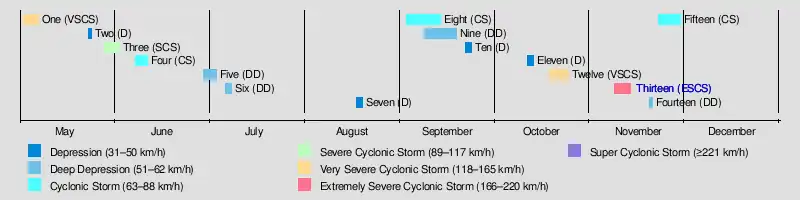 Twelve | October 18–22, 1970 | Very Severe Cyclonic Storm | 130 km/h (80 mph) | 980 hPa (28.94 inHg) | Tamil Nadu, West Bengal, Bangladesh | 200-300 | [2] | |