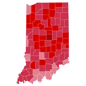 Nixon carried Indiana with 66.11% of the vote to McGovern's 33.34%, a victory margin of 32.77% as well as the best Republican performance in Indiana history. Although Indiana is one of the most reliable Republican states in the country, this is the only occasion where a Republican candidate (indeed, where any Presidential candidate) carried every county in the state.[1] As of the 2020 presidential election, this is the last time a Republican won Democratic-leaning Lake County in the northwestern corner of the state.[2]