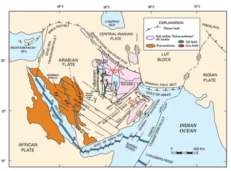 The Iranian plateau is a broad zone of deformed continental crust as it is wedged between the Arabian and Eurasian plates. The Arabian Plate, located southeast of the plateau, undergoes oblique convergence with the Eurasian Plate in the northeast at a rate of 22 cm (8.7 in) annually. Deformation of the crust is distributed non-uniformly by the fold and thrust belts of the Zagros, Alborz, and Kopet Dag; oceanic lithosphere subduction along the Makran Trench; and strike-slip and reverse faulting within the plateau. The Iranian plateau itself is divided into rigid tectonic blocks. These crustal blocks are aseismic, but at their boundaries, seismicity is high.[3]