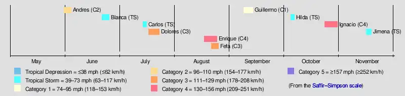Seasonal activity in 1979 remained within the confines of a traditional hurricane season, which begins on May 15 and ends on November 30 in the East Pacific basin.[nb 2] Those dates conventionally delimit the period during each year when most tropical cyclones occur.[2] The season's first system, Andres, developed on May 31, while the year's final cyclone, Jimena, dissipated on November 18. In early June, Andres moved onshore Mexico as a minimal hurricane, while in late October, Ignacio struck the coastline as a tropical depression. Impacts from those storms were minimal, as were the effects of the preponderance of systems during the season. No casualties or damage were reported onshore, but two fishermen drowned offshore.[3]