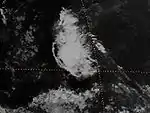 On August 28, a tropical wave emerged into the Atlantic off the west coast of Africa. At 00:00 UTC on September 1, the system developed into Tropical Depression Seven, while centered roughly midway between the Lesser Antilles and the west coast of Africa.[25] Sixteen hours later, the National Hurricane Center initiated advisories on the depression.[26] The depression tracked westward in the trade winds during the following three days, without any intensification. After curving northwestward an Air Force reconnaissance flight found little evidence of a closed circulation, while satellite imagery also showed a disorganized and elongated cloud pattern on September 4.[25] As a result, it was determined that the depression degenerated into a tropical disturbance at 06:00 UTC on that day.[27] However, the National Hurricane Center did not discontinue advisories until 22:00 UTC.[28]