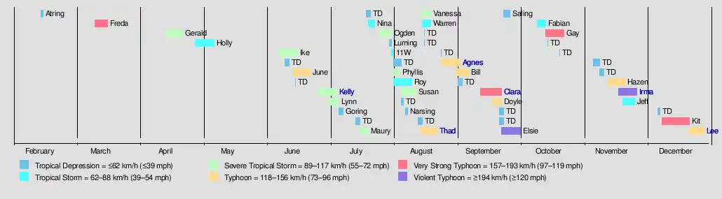 The season started with Freda, which became the fourth March typhoon for the basin since 1959. The system passed west of Wake Island before dissipating on March 17. Gerald formed in mid-April near an upper-level low, and recurved just east of Guam bringing the island heavy rainfall. Holly formed in the middle of the tropical Pacific Ocean in late April, and dissipated far from land on May 7. Ike was the first system to form in the South China Sea, living during the second week of June before recurving across Taiwan and becoming an extratropical cyclone. June formed during the third week of June, and moved just east of Taiwan before approaching Japan as a nontropical cyclone. Kelly crossed the Philippines on July 1, moving into Vietnam on July 4. Lynn moved nearby the northern Philippines before making landfall in mainland China on July 7. Maury tracked near Taiwan, China, and eventually Vietnam as a remnant low during the third and fourth weeks of July. Nina formed on the northeast fringe of Maury, also moving into mainland China on July 23, three days after Maury. Ogden moved into Japan at the end of July, approaching Korea early in August.