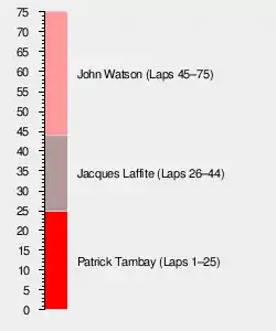 Laffite was now in the lead, with Patrese in second. By lap 28, the McLarens were lying third and fourth, having passed Marc Surer, Sullivan and Johnny Cecotto. When Watson got by Lauda at the end of Shoreline Drive, he was 20 seconds behind the two leaders. With Watson closing the gap to the front and Laffite's tires going off quickly, Patrese challenged Laffite for the lead. He slid wide, and Watson and Lauda both passed before he rejoined the track. Soon after, the McLarens passed Laffite as well, and, from 22nd and 23rd on the grid, were now first and second.