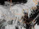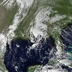 The origins of Tropical Storm Edouard are unclear, but an area of persistent organized storms formed in the Bay of Campeche, which strengthened into a tropical storm on September 14. Edouard rapidly intensified, with wind speeds reaching 65 miles per hour (105 km/h) in 18 hours as a faint eye feature became visible. Following its strengthening, Edouard dissipated even more quickly, degenerating into an area of thunderstorms the next day.[36] The remnants of Edouard moved over land near the port of Veracruz.[37]