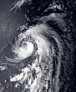 A tropical depression formed south of Manzanillo, Colima, at 12:00 UTC on September 5. It became Tropical Storm Marie six hours later and further intensified into a hurricane by 00:00 UTC on September 7. Marie northwest over warm waters and reached peak winds of 90 mph (140 km/h) on September 8.[4] As the storm bypassed Baja California to the west, it encountered colder waters and began to weaken. A reconnaissance aircraft mission into the storm later that day measured a large, poorly-defined 58 mi (93 km) diameter eye. Subsequent investigations of Marie found a storm becoming increasingly disheveled over 68 °F (20 °C) waters;[3] it dissipated after 00:00 UTC on September 11.[4]