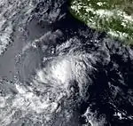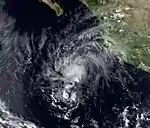 At 18:00 UTC on September 17, a tropical depression formed to the south of Acapulco.[3] It developed into Tropical Storm Norbert six hours later and into a hurricane by 00:00 UTC on September 20.[4] The cyclone originally moved west-northwest and north under the influence of a ridge near Acapulco. However, that ridge shifted southwest while an upper-level trough progressed into northern Mexico, forcing Odile to the east.[3] The hurricane attained peak winds of 105 mph (169 km/h),[4] Category 2 intensity, early on September 22 to the east of nearby Hurricane Norbert. Another upper-level trough diving into Baja California caused Odile to quickly veer northwest, and it made landfall about 45 mi (72 km) northwest of Zihuatanejo, Guerrero, at 18:00 UTC on September 22,[3] harboring winds of 60 mph (97 km/h). The system transitioned into an extratropical cyclone and dissipated after six hours.[4]