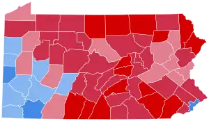 Reagan won the state by sweeping the small towns and rural areas of central Pennsylvania and performing well in the traditionally Republican suburbs of Philadelphia, but the race was kept within single digits by Mondale’s strong showing in heavily unionized and traditionally Democratic Western Pennsylvania, as well as his decisive victories in the cities of Pittsburgh and Philadelphia. As of the 2020 presidential election, this is the last election in which Lackawanna County has voted Republican, the last time that Erie County gave a majority to a Republican (Donald Trump would win it by plurality in 2016), and the last time a Republican won one-third of the vote in Philadelphia.[1]