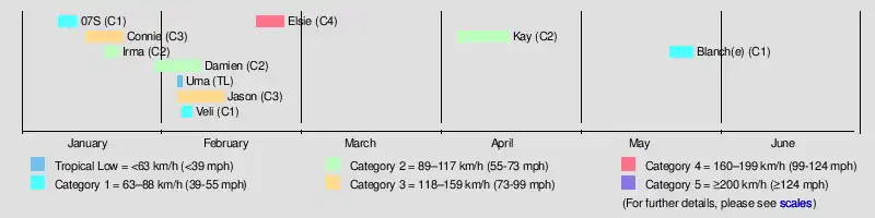 Name | Dates | Peak intensity | Areas affected | Damages (AU$) |