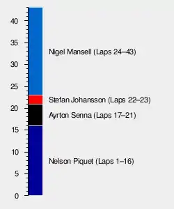 Both Berger and Prost pitted at the end of lap 1 with Berger in for a long stop for repairs and Prost for a new nose cone, his rear suspension survived intact despite its unscheduled first corner flight. Mansell disposed of Senna on lap 2, but spun on lap 5,[4] falling back to 4th place. Piquet led until suffering turbo failure on lap 16 leaving Senna in front from Mansell, who shortly overtook Senna during pitstops. Prost emerged last on the road and only a few hundred metres in front of the leading Williams. On his way to being the last car on the lead lap and finishing in sixth place he set a new lap record of 1:59.282 on lap 31.