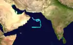 The monsoon trough spawned a tropical depression on June 4 in the Arabian Sea. It tracked due eastward, becoming a tropical storm later that day and reaching a peak of 60 mph winds on the 6th. The storm turned abruptly northward, turned westward and executed an anticyclonic loop. Vertical shear caused the system to dissipate on the 12th.