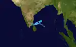 The eighth and final storm of the season formed on December 17 northeast of Sri Lanka. It moved westward, and executed an elongated loop lasting 4 days. It briefly reached tropical storm strength before vertical shear weakened it again, and the system hit eastern India on the 23rd.