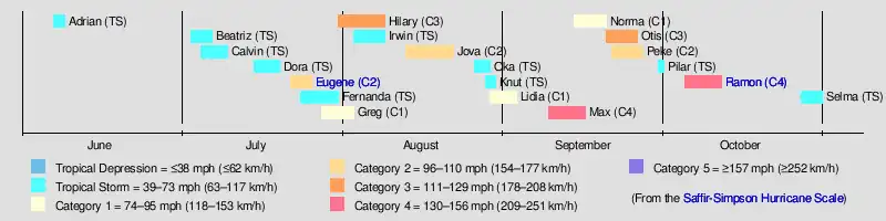 Only one tropical storm developed in June. In July, six named storms formed. Out of these storms, Hilary was the only storm to reach major hurricane status.[3] The month of August had a total of five named storms, four of which became hurricanes. However, August did not feature any major hurricanes, though Hurricane Jova came close, peaking as a moderate Category 2. The month of September held the same number of named storms as August, with five named storms.[3] The month also was the carrier of the strongest hurricane on record at that time (that had its intensity estimated from satellite imagery), Hurricane Max, a strong Category 4 hurricane. Hurricane Norma was a Category 1 hurricane on the Saffir–Simpson scale, which dissipated to the south of the Baja California Peninsula.[5] The month of October featured only two tropical cyclones. The first system, Ramon, was a Category 4 hurricane.[3]
