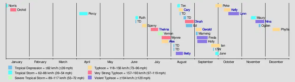 Nina (Sisang) | November 19–30 | Typhoon | 165 km/h (103 mph) | 930 hPa (27.46 inHg) | Caroline Islands, Philippines, South China | $84.5 million | 912 | |