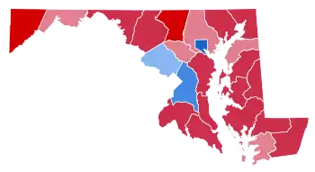As of 2020, this remains the last time that the Republican presidential candidate has won the state of Maryland, as well as Baltimore County and Howard County.[3] Maryland was one of only two states that Bush carried in 1988 which had voted for Jimmy Carter in 1980, the other being Carter's home state of Georgia.[4] This also marks the only occasion since 1952 in which Maryland has given an outright majority to a non-incumbent Republican.