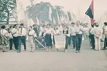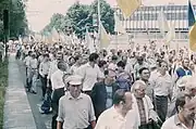 At the same time, Ukrainian independence activists were organising in less confrontational ways, including cooperation with the Soviet Ukrainian government on celebrating the 500th anniversary of the Zaporozhian Sich. As part of the three-day celebration in August 1990, soldiers of the Soviet Army helped install the flag of the Ukrainian Insurgent Army and provide accommodations for participants, while events included commemorations of Cossack leader Ivan Sirko and historian Dmytro Yavornytsky, a gathering of Cossack groups from throughout Ukraine, a scientific conference discussing the Zaporozhian Sich,[22] and a 500,000-member march in the city of Zaporizhzhia.[23] These celebrations helped to cement Cossacks as a part of the Ukrainian national consciousness.[24]