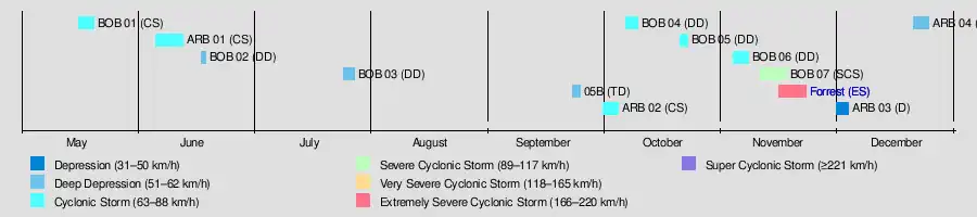 Overall, there was a total of 12 depressions, of which 7 became cyclonic storms, and 1 further strengthened to a very severe cyclonic storm.[4] These totals were slightly above the long-term average of 5.4 cyclonic storms for the basin.[5] In contrast to this, the JTWC reported record-breaking activity with 13 tropical cyclones, 11 of which became tropical storms. This included record activity in the months of October and November, each having three storms, while July saw its first system on record.[1] The first storm of the year was Cyclonic Storm BOB 01 which formed on May 16 while the last was Deep Depression ARB 04 which dissipated over Somalia on December 24. The most intense was Very Severe Cyclonic Storm Forrest, which attained peak three-minute sustained winds of 185 km/h (115 mph).[4] Severe Cyclonic Storm BOB 07 proved to be the deadliest and most destructive of the year, claiming 263–423 lives across southern India and leaving $69 million in damage. Collectively, the season's storms killed at least 400 people and left another 549 missing.