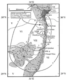 The 1992 Cairo earthquake, also known as the Dahshur earthquake, occurred at 15:09 local time (13:09 UTC) on 12 October, with an epicenter in the Western Desert near Dahshur, Giza, 35 km (22 mi) south of Egypt's capital and most populous city, Cairo. The earthquake had a magnitude of either 5.8[1][2][3] or 5.9,[4][5][6][7] but was unusually destructive for its size, causing 561 deaths and injuring 12,392 people.[8] It also made over 30,000 families homeless in tens of cities and villages across 16 governorates, in Greater Cairo, the Delta, and northern Upper Egypt. It was the most damaging seismic event to affect Egypt since 1847.[1]