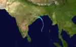A surge in the monsoon trough spawned a new tropical disturbance over the Bay of Bengal on June 14. Moving northward,[10] the system consolidated and was classified a depression on June 17.[4] Turning northwest, the system deepened into a tropical storm and struck Odisha, India with winds of 85 km/h (55 mph) later that day.[10] According to the IMD, the system peaked as a deep depression with 55 km/h (35 mph) winds and a pressure of 980 mb (hPa; 28.94 inHg).[4] Once onshore, the cyclone weakened to a depression before being last noted by the JTWC on June 18.[10] The IMD continued to monitor the remnant disturbance through June 20 by which time it was situated over Madhya Pradesh.[4]