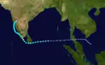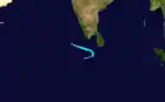 A disturbance over the South China Sea became a weak tropical depression on November 6. It moved westward, crossing the Malay Peninsula and entering the Bay of Bengal on the 8th. On the 11th, the system became Tropical Storm Ten, and hit southern Sri Lanka as a 65 mph storm on the 12th. The next day it became a cyclone with a peak of 80 mph winds before hitting southern India. After clearing Sri Lanka, the storm intensified further into a severe cyclonic storm, attaining peak three-minute winds of 100 km/h (60 mph) and a pressure of 988 mb (hPa; 29.18 inHg).[20] After weakening to a tropical depression over India, it restrengthened to a 65 mph storm before making landfall on western India on the 17th.