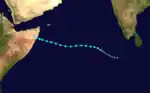 In early June, a small area of low pressure developed within the monsoon trough over the southeastern Arabian Sea. Following a notable increase in convection on June 4, a Tropical Cyclone Formation Alert (TCFA) was issued and the JTWC initiated advisories on the system as a tropical depression the following day. After reaching tropical storm strength early on June 6, increasing wind shear displaced convection from the circulation center and prevented further development. Steering currents simultaneously became weak as the storm turned northward and moved along an inverted "S-shaped" path for three days before resuming a general eastward motion. Though already classified a tropical storm by the JTWC,[9] the IMD did not start monitoring the system as a depression until June 8. The agency assessed the cyclone to have attained winds of 85 km/h (55 mph) on June 11 well to the southeast of Yemen.[4] The storm ultimately succumbed to persistent wind shear and dissipated on June 12 just north of the island of Socotra.[9]