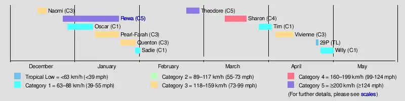 Rewa | 26 December – 23 January | Category 5 severe tropical cyclone | 205 km/h (125 mph) | 920 hPa (27.17 inHg) | Melanesia, Eastern Australia, New Zealand | Unknown | 22 | |