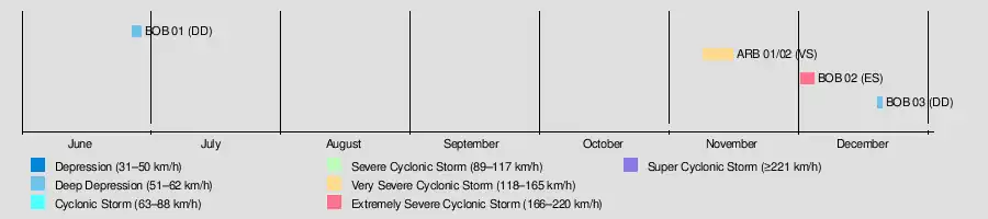 ARB 01/02 | November 8–16 | Very Severe Cyclonic Storm | 120 km/h (75 mph) | 986 hPa (29.12 inHg) | India, Pakistan | Unknown | 644 | [2][11] |